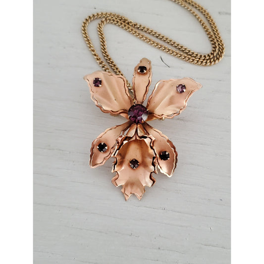 Bugbee and Niles Gold Tone and Purple Rhinestones Orchid Brooch Necklace
