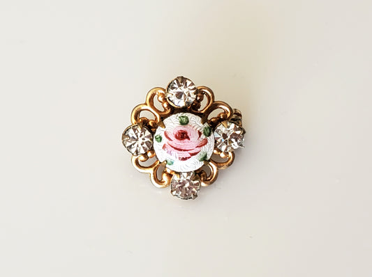 Vintage Petite Guilloche Cameo Rose Rhinestone Brooch Pin