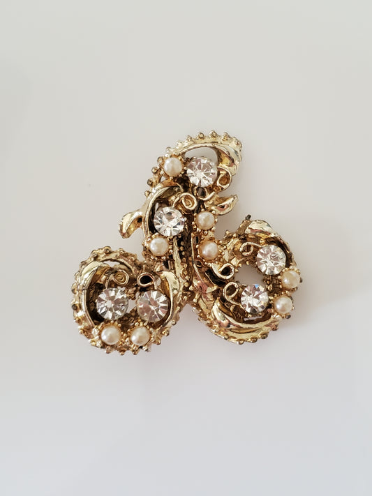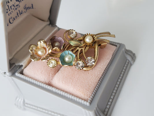Vintage Metal Pastel Enamel Rhinestone and Faux Pearl Brooch