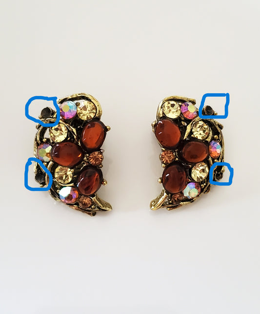 Vintage Mid-Century Amber and AB Rhinestone Clip On Earrings by Weiss