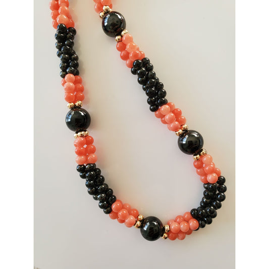 Vintage Braided Black and Salmon Coral Color Glass Bead Necklace