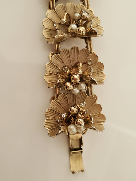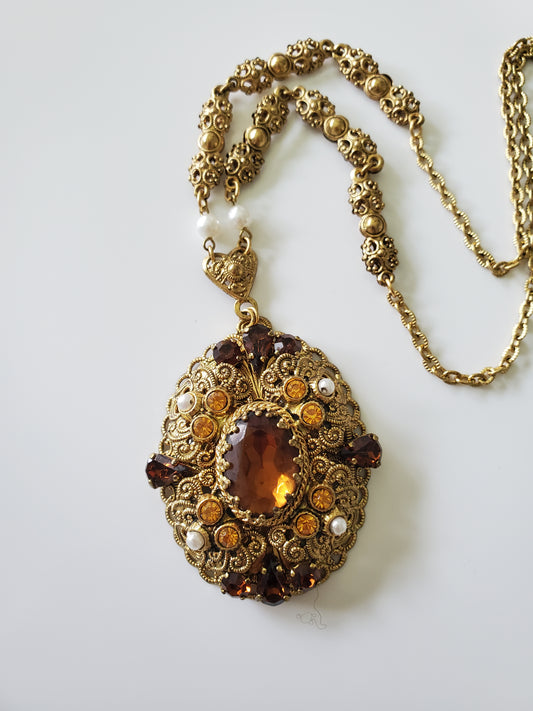 Vintage West Germany Faceted Art Nouveau Amber and Faux Pearl Filigree Necklace