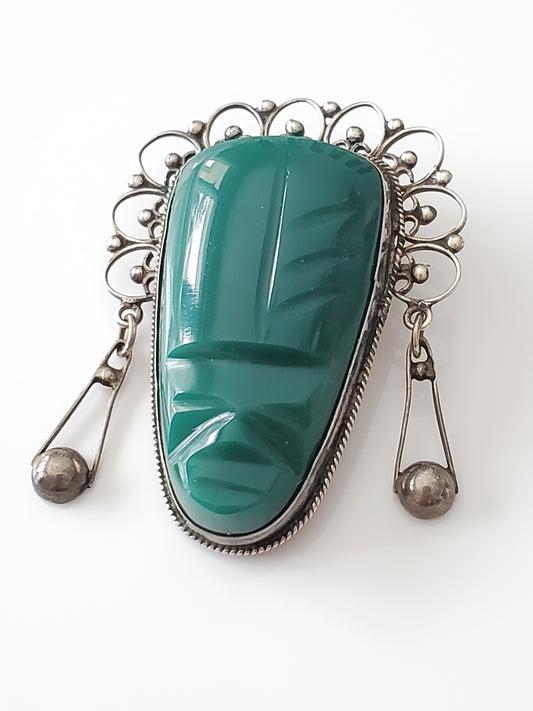 Vintage Sterling Silver Carved Chrysoprase Aztec Mayan Warrior Pin Brooch