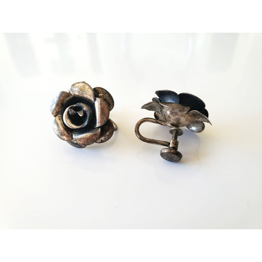 Vintage Beau Sterling Silver Rose Screw On Earrings