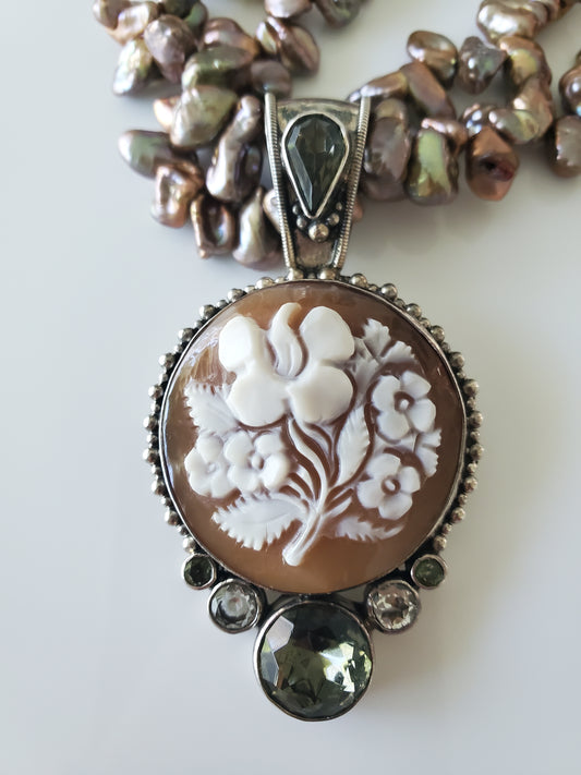Freshwater Baroque Bronze Pearl and Handcarved Floral Cameo Sterling Necklace