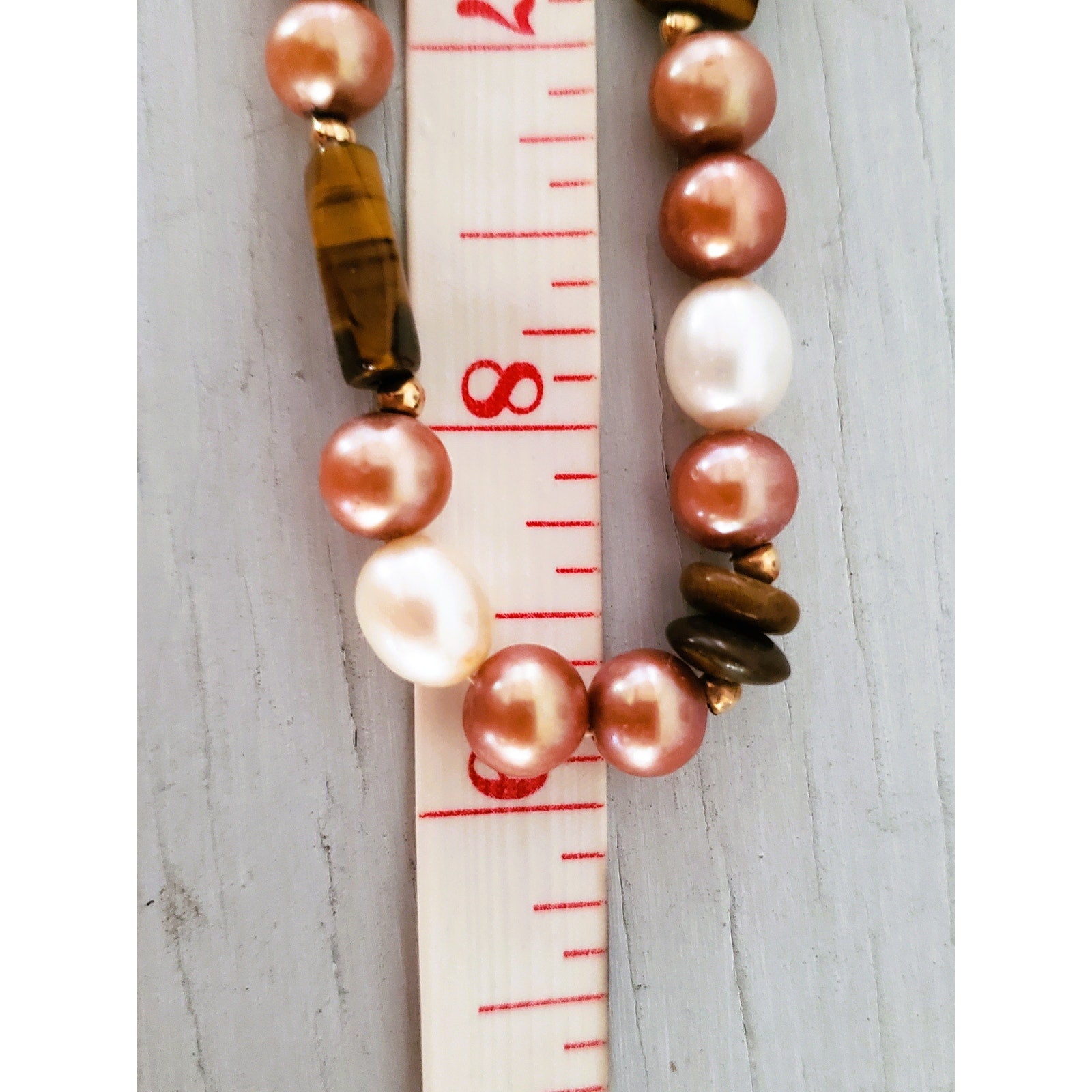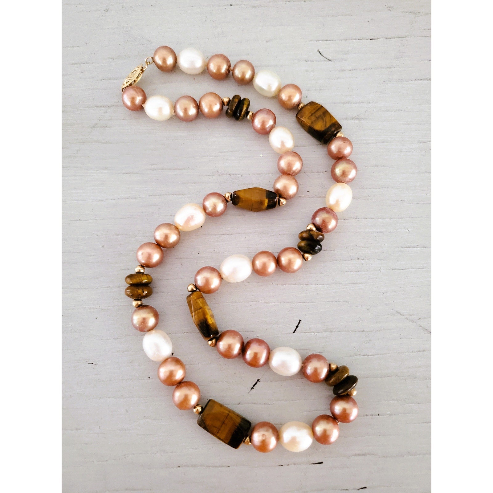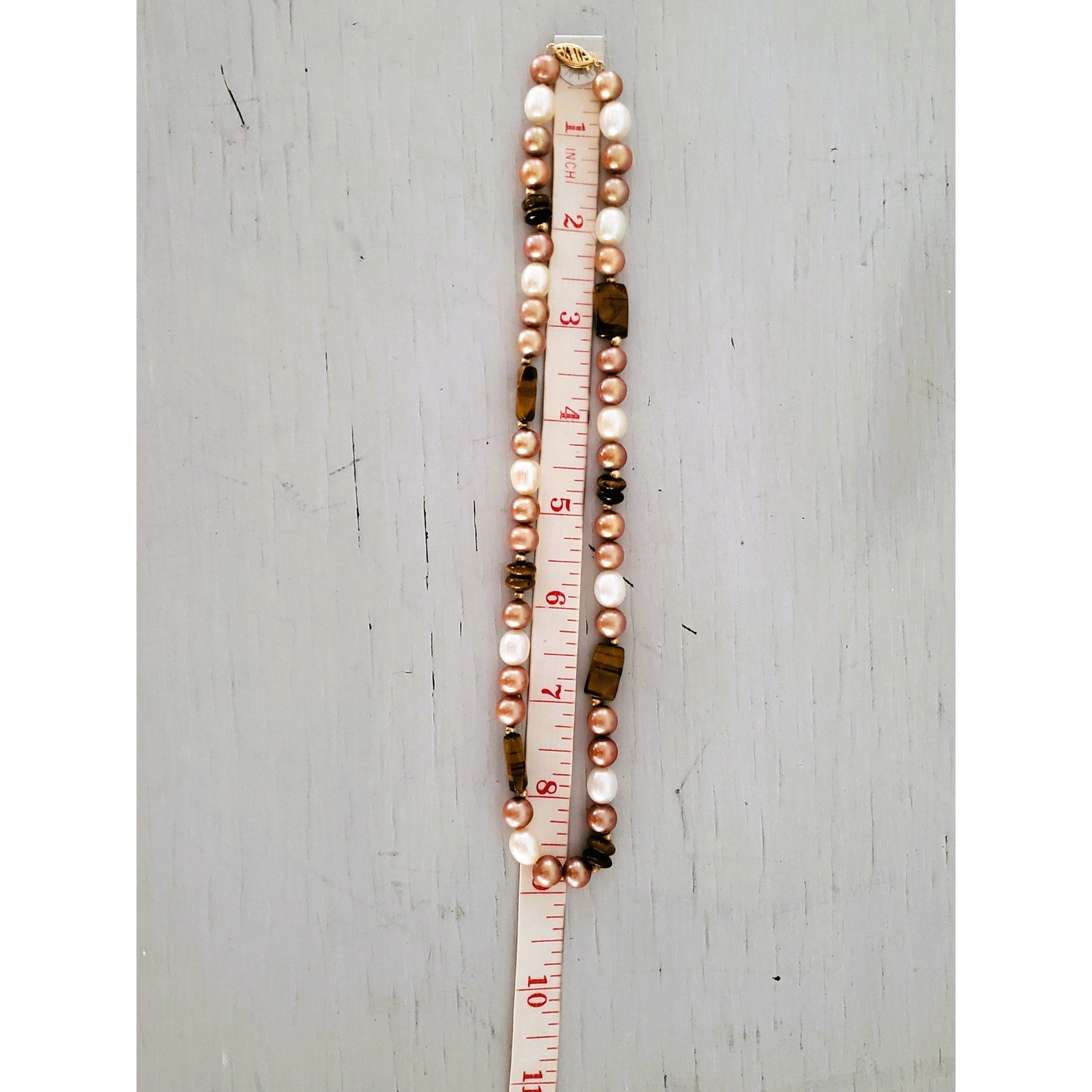 14K Gold Honora Natural Brown Cream Pearl & Tigers Eye Necklace