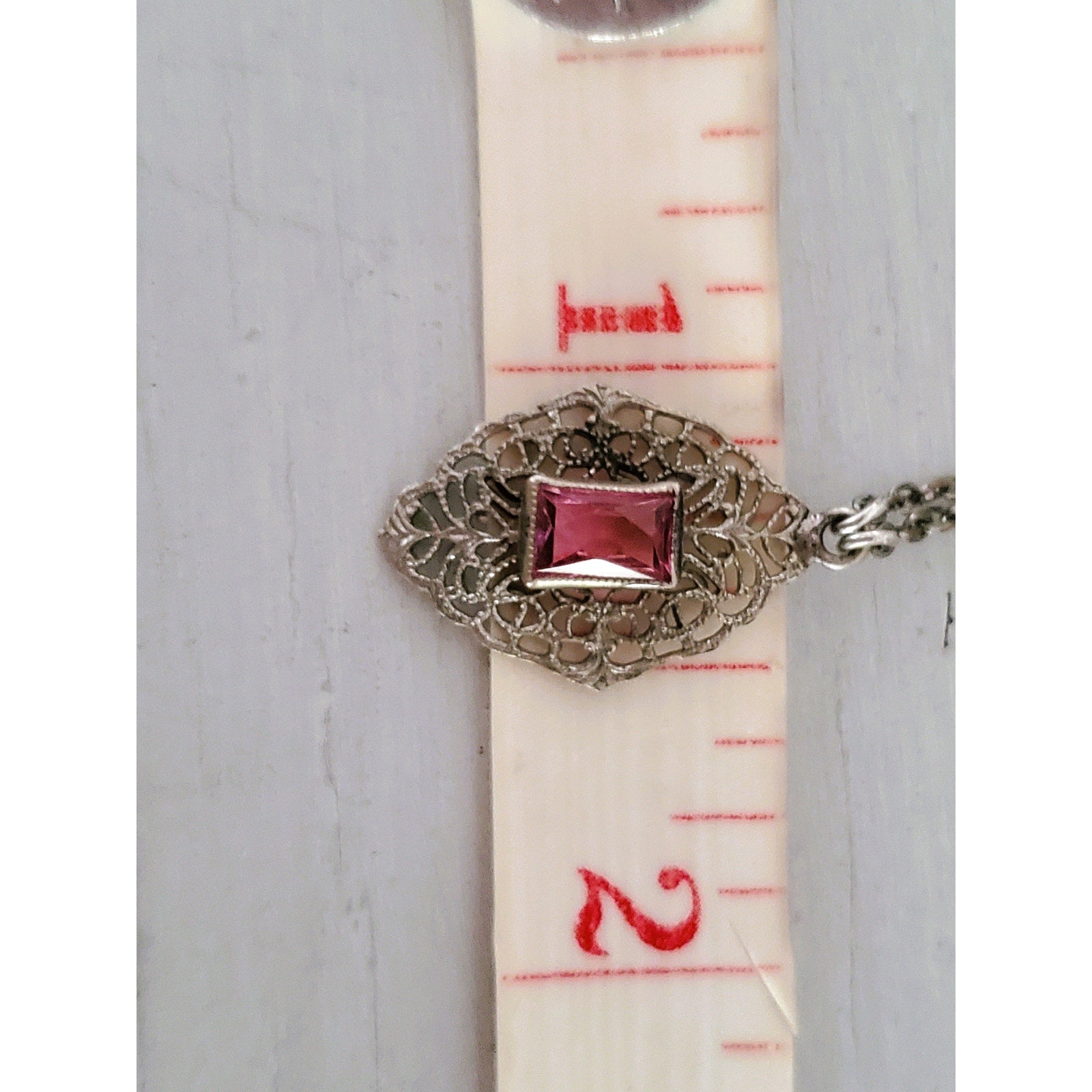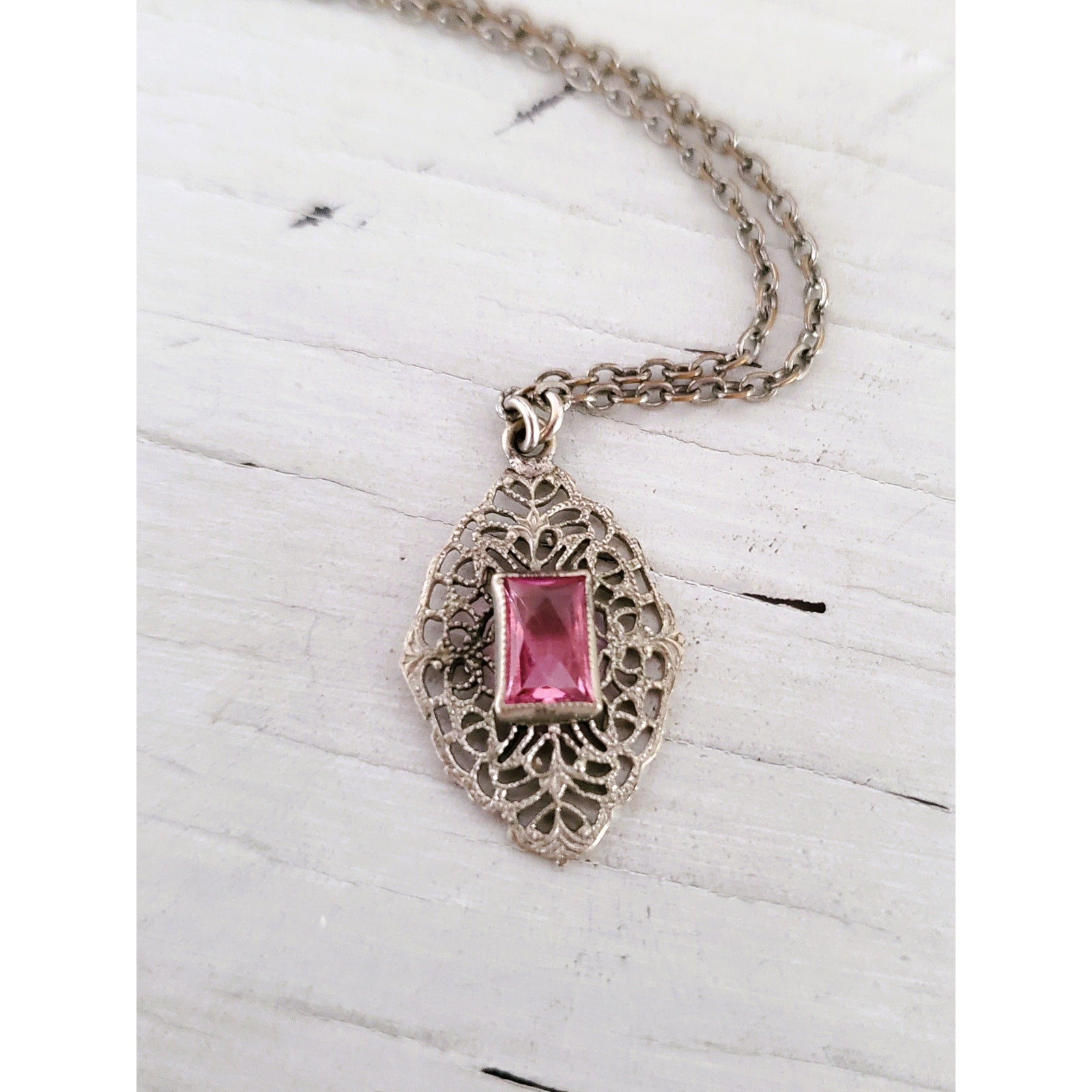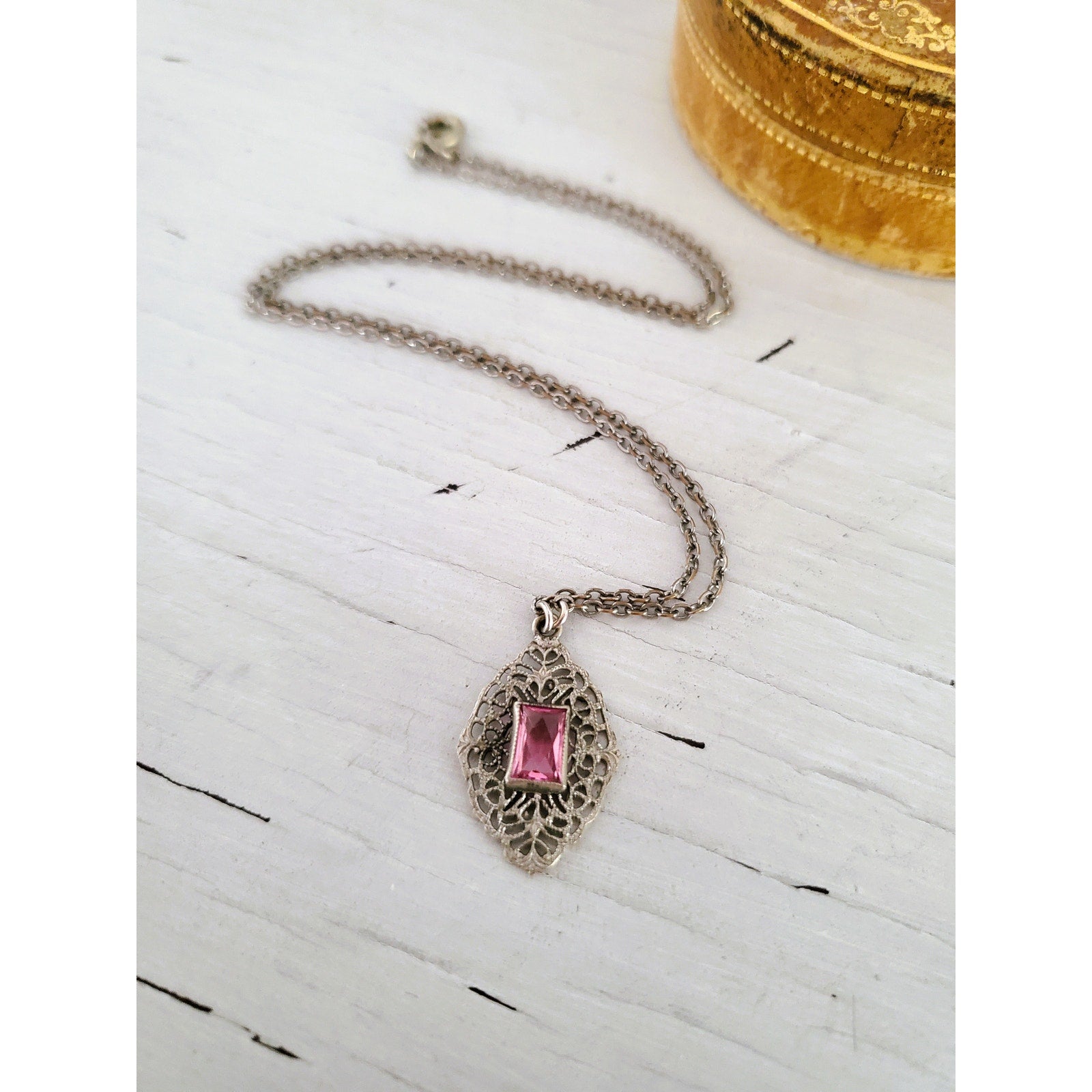 Antique Art Deco Pink Stone Filigree Child Size Necklace