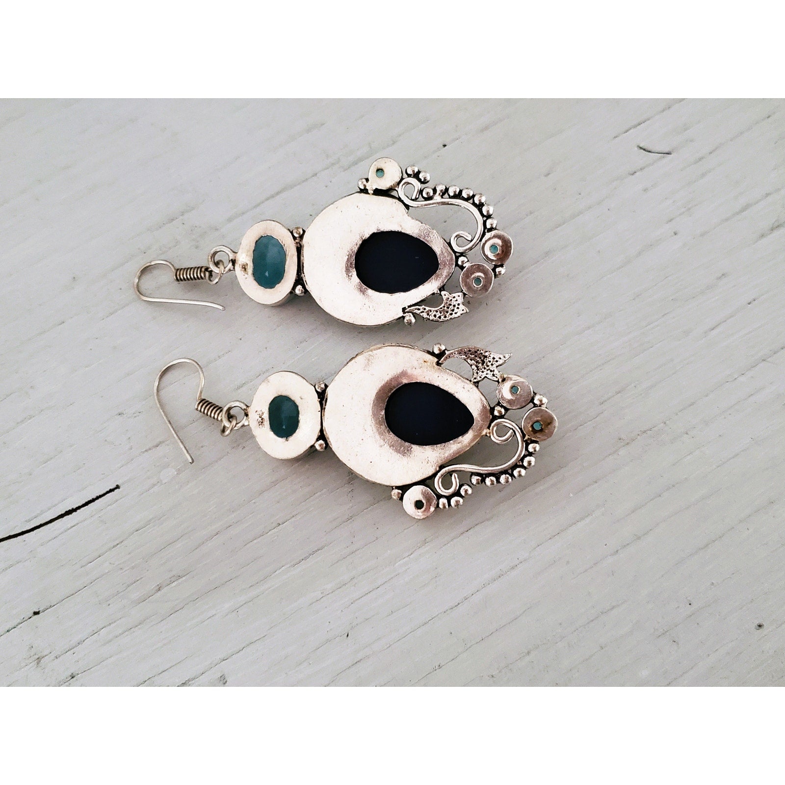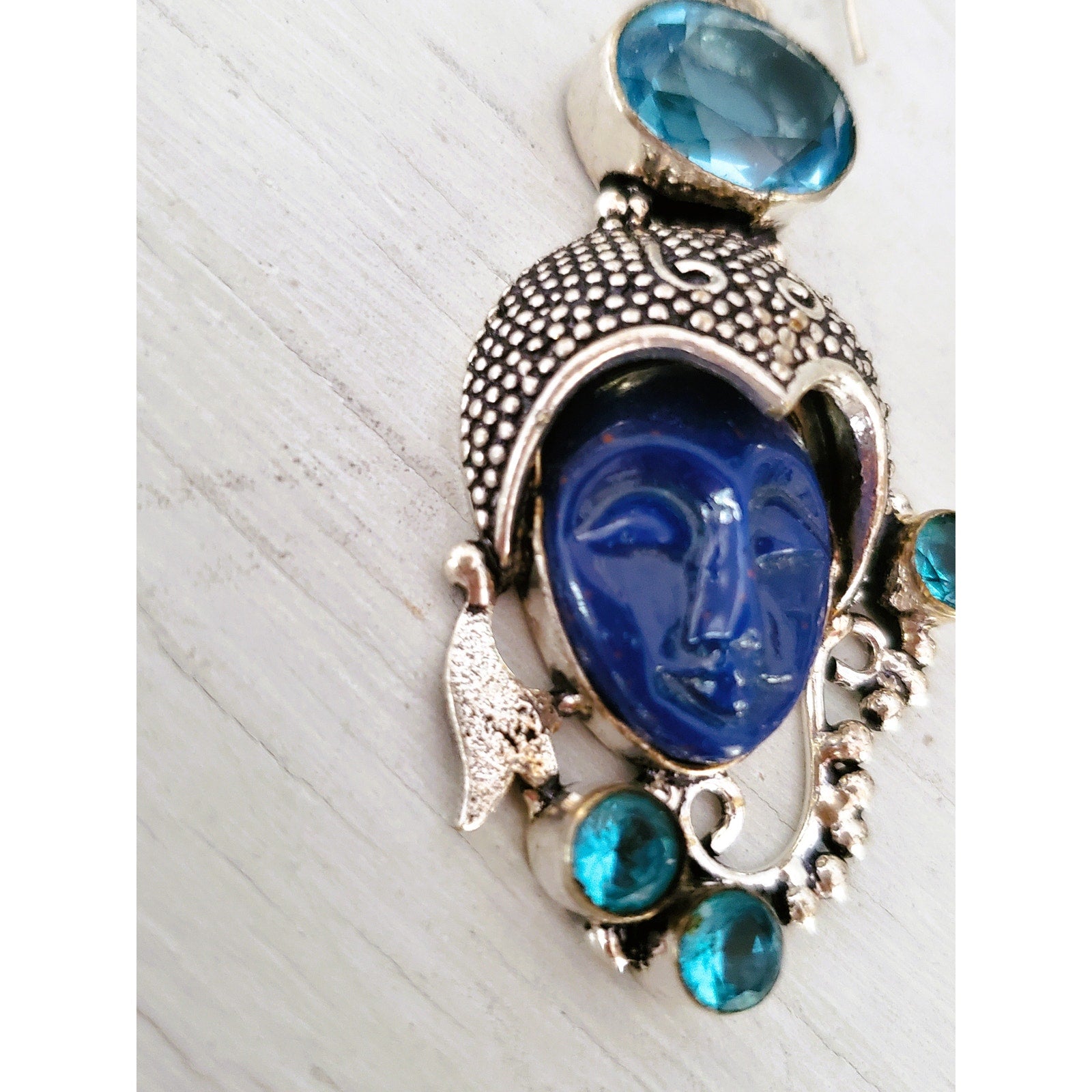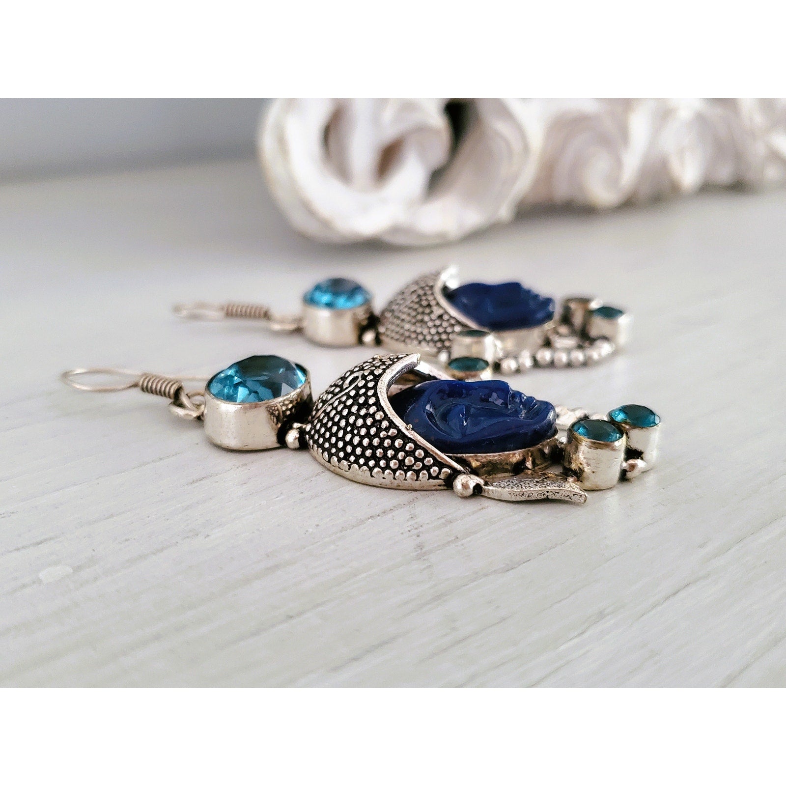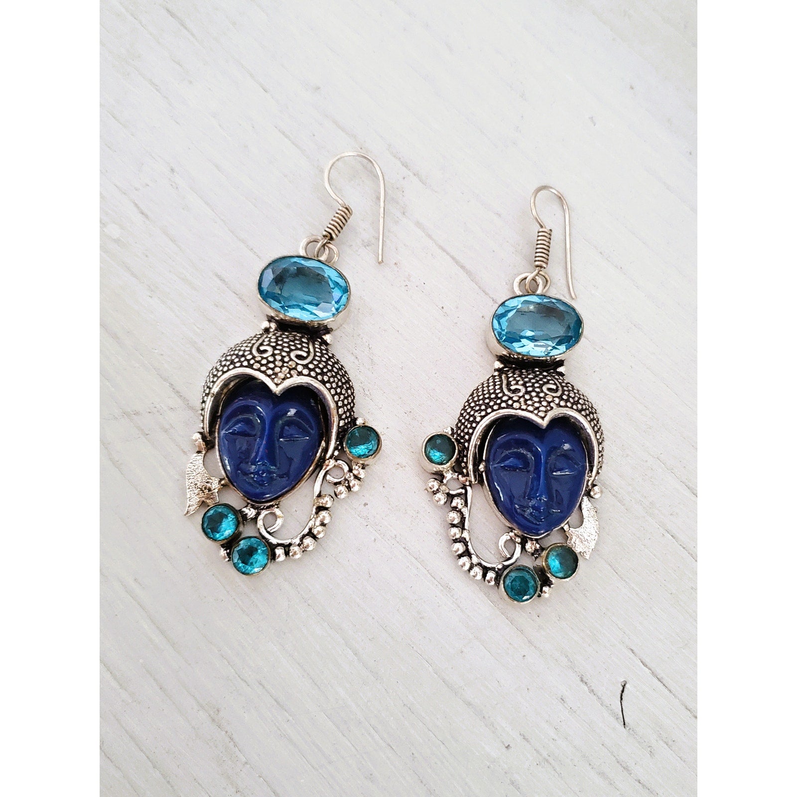 Sterling Silver Balinese Goddess Blue Face Topaz Statement Earrings