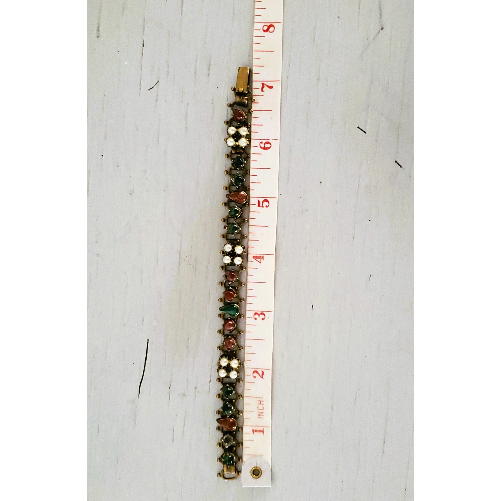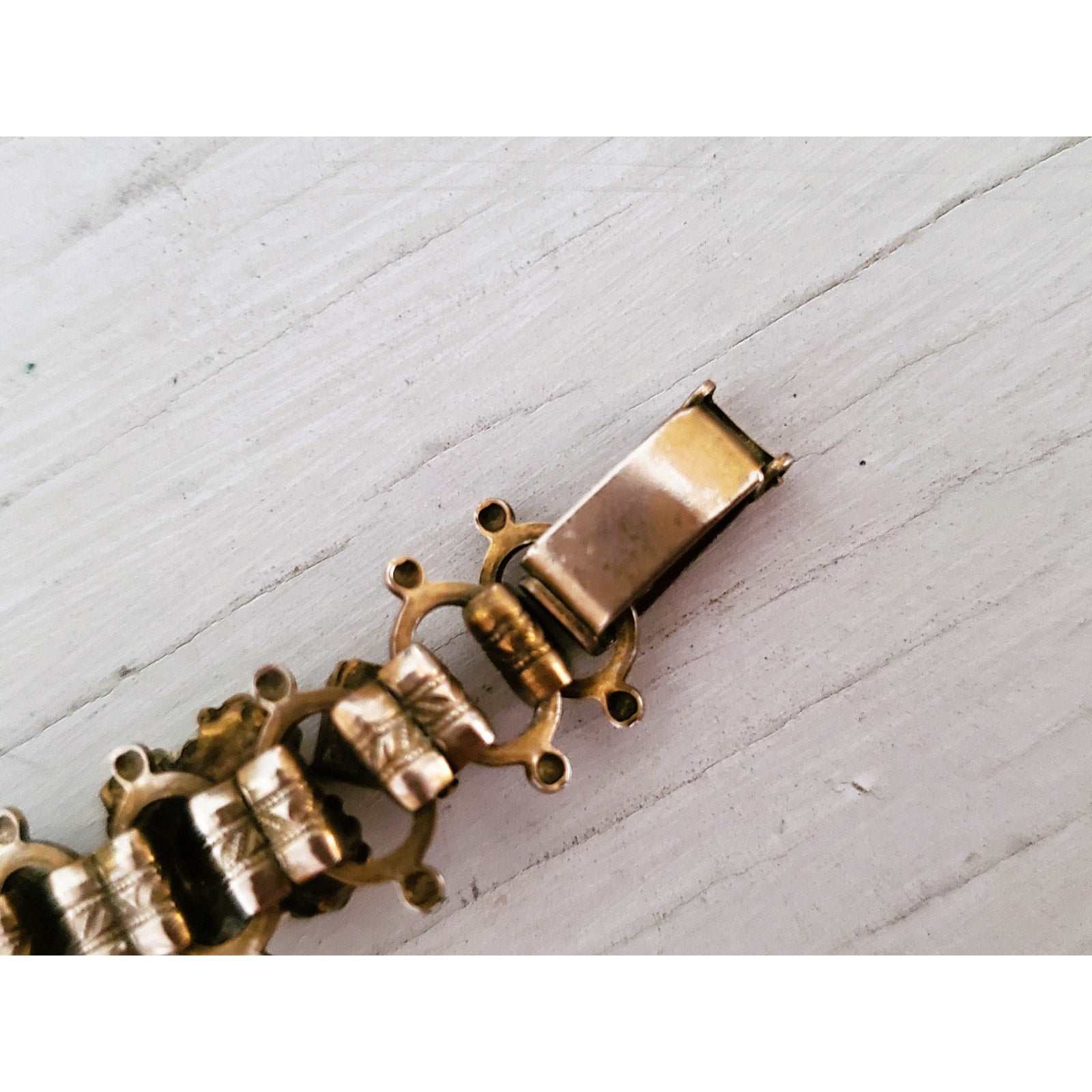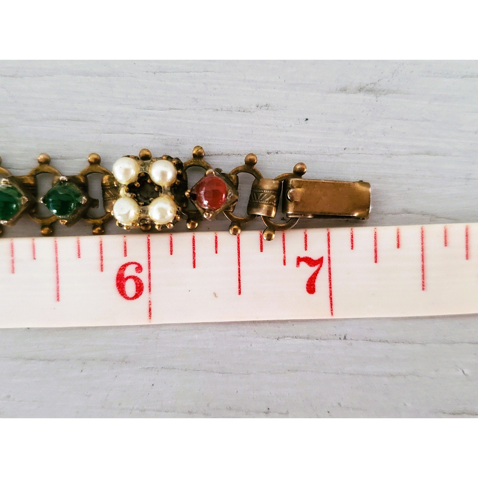 Victorian Revival Brass Filigree Faux Pearl & Glass Stone Bracelet