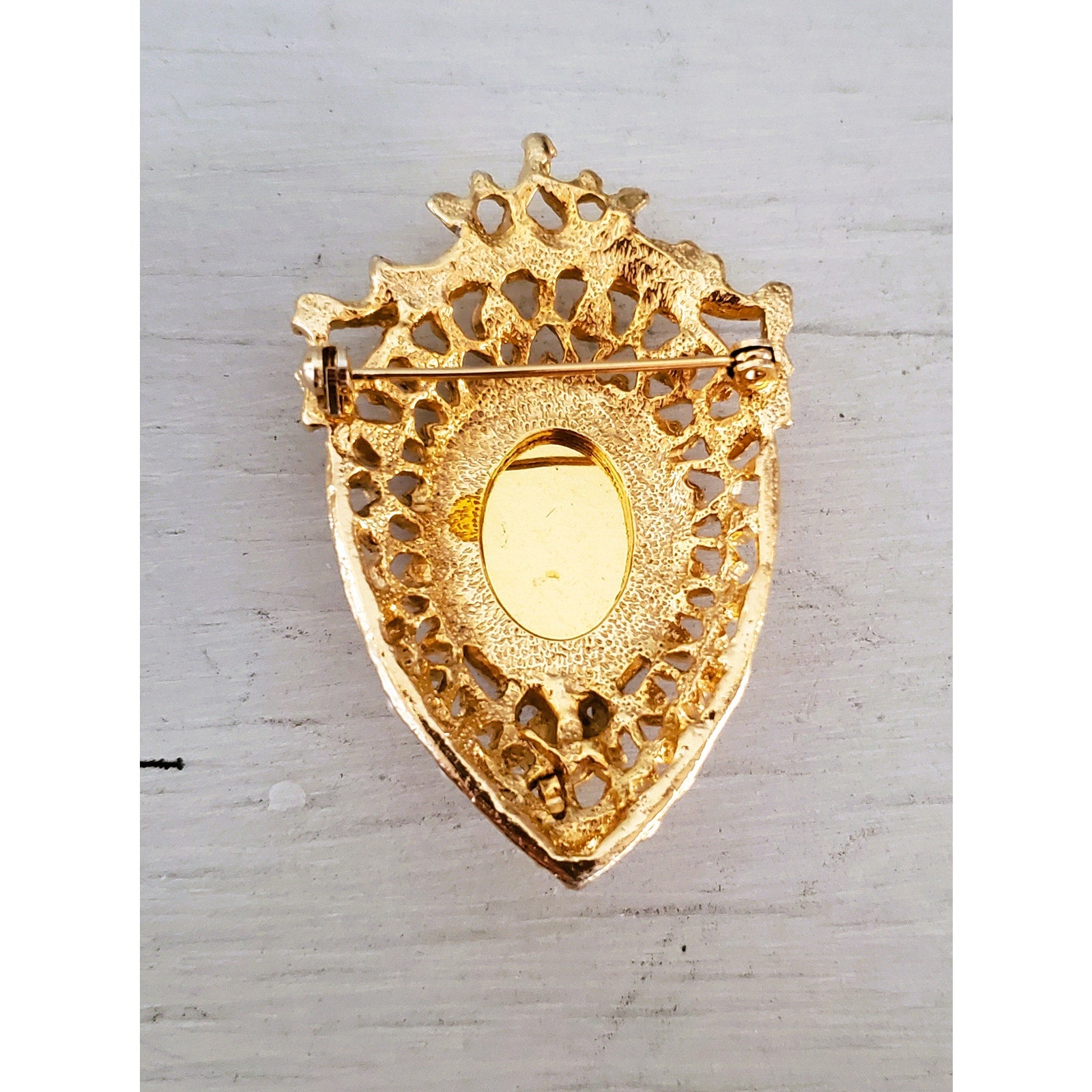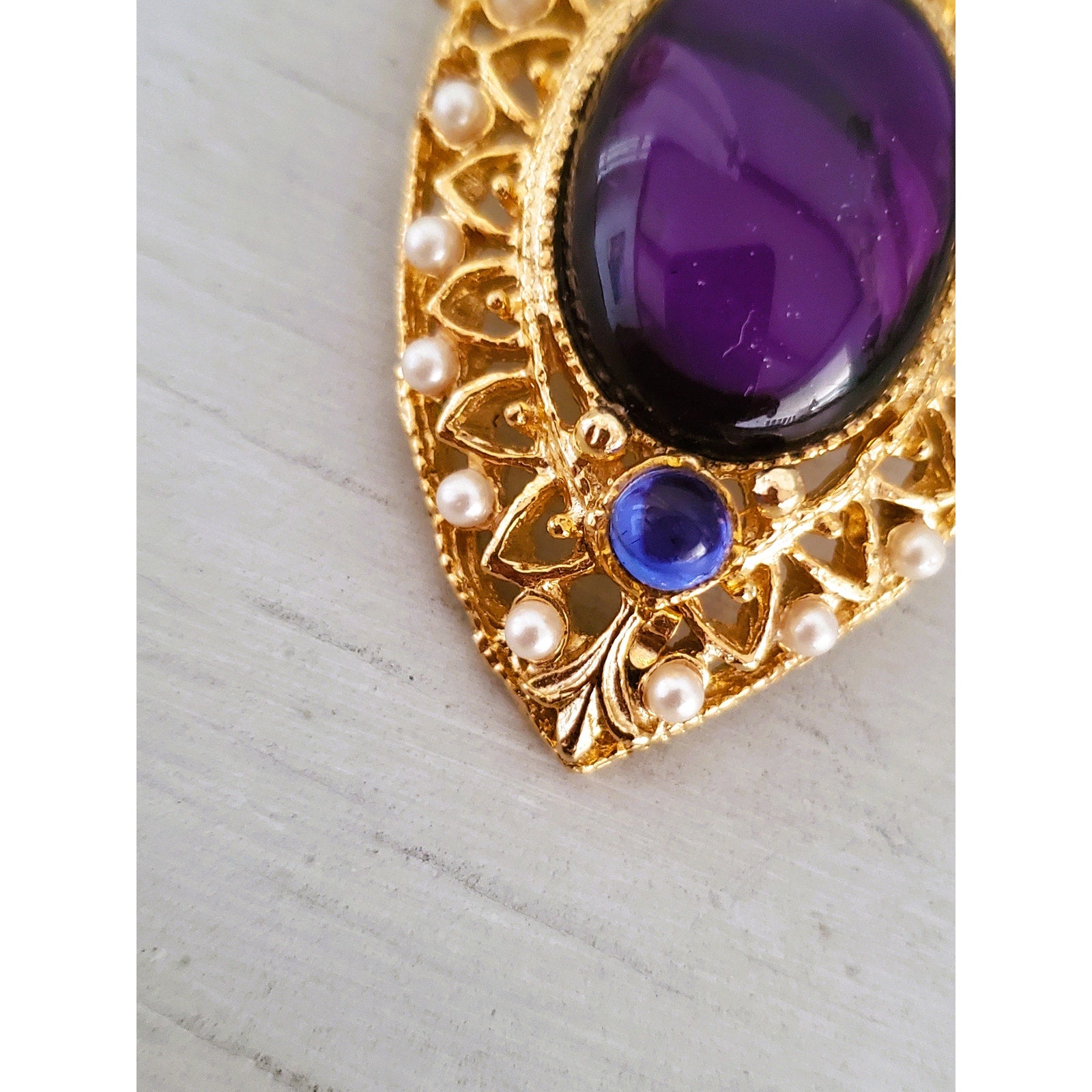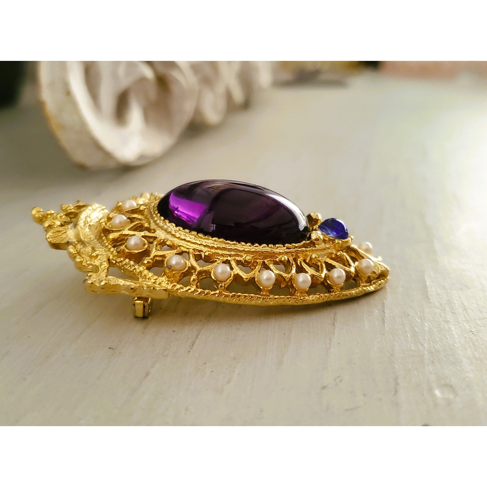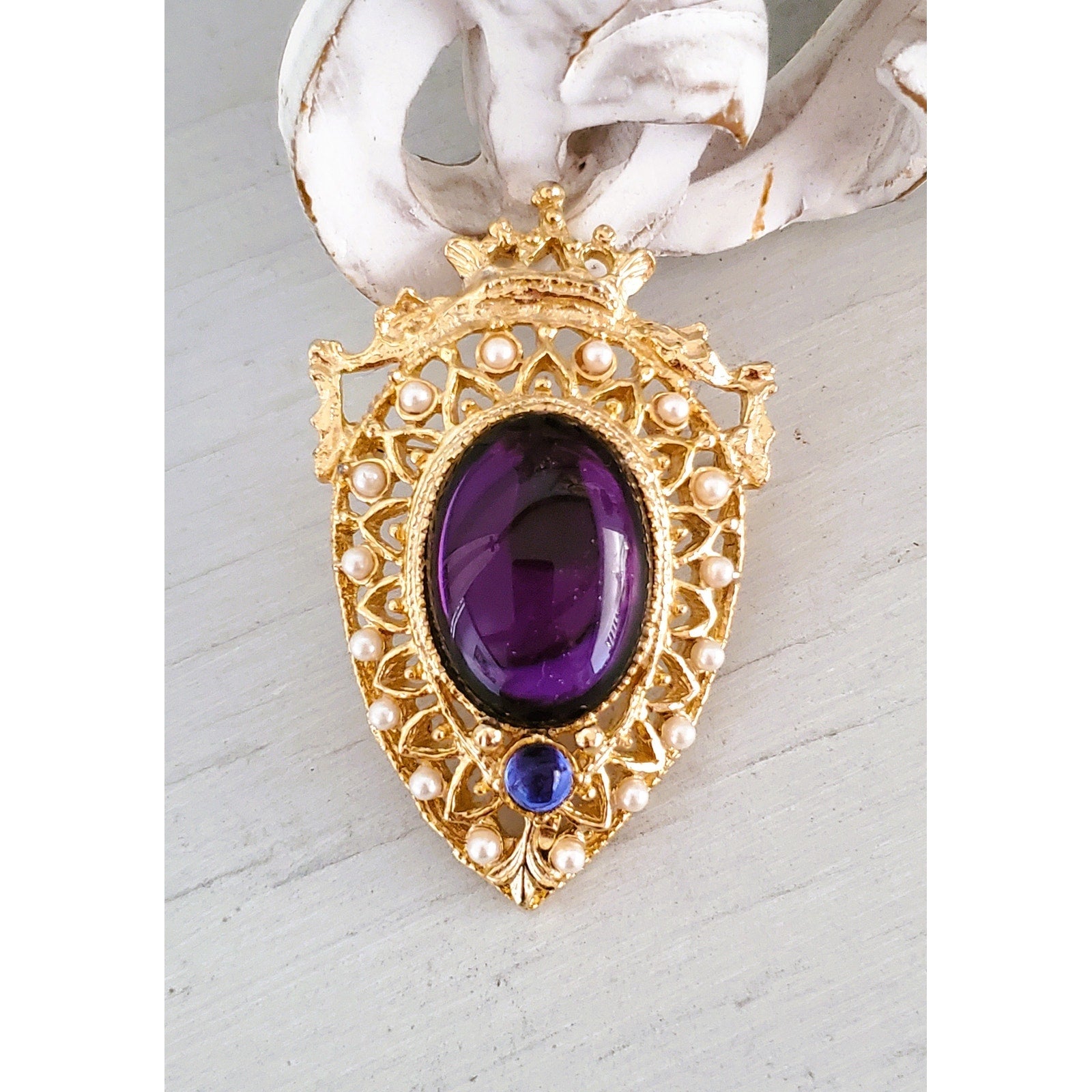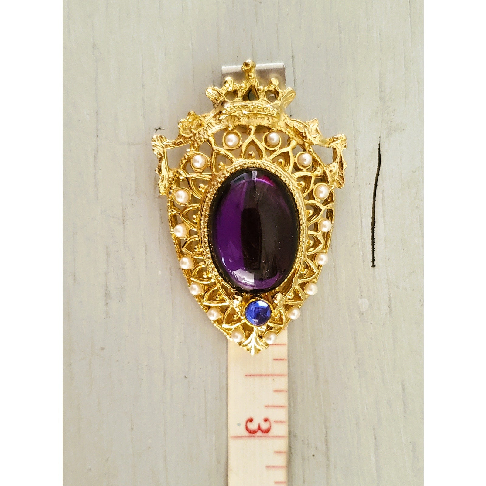 Vintage Purple Stone and Faux Pearl Crown Brooch