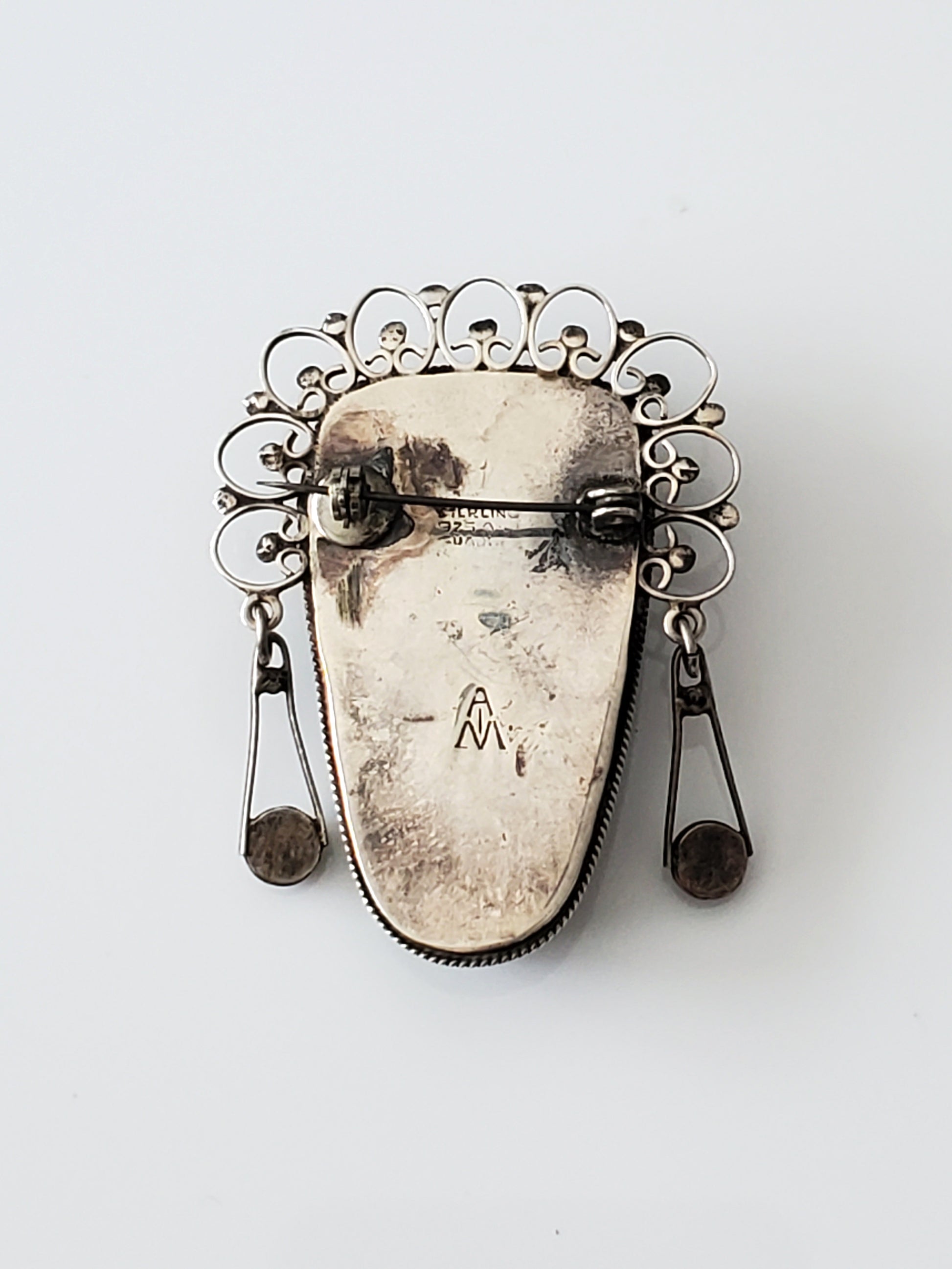 Vintage Sterling Silver Carved Chrysoprase Aztec Mayan Warrior Pin Brooch